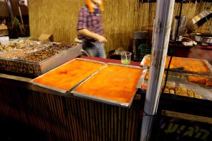 След разходката из Яфа се върнахме отново сред светлините на модерния град Тел Авив, за да открием и другата част от крайбрежната алея, където по време на шабат беше отворен кулинарен маркет с местни специалитети – рай за хората, които обичат да опознават вкусовете на местната храна. Тук опитах т. нар. кнафе – представлява два слоя кадаиф, добре напоени с масло, между които има слой меко козе сирене. Кадаифът отгоре е ярко оранжев и поръсен със счукан шам фъстък.