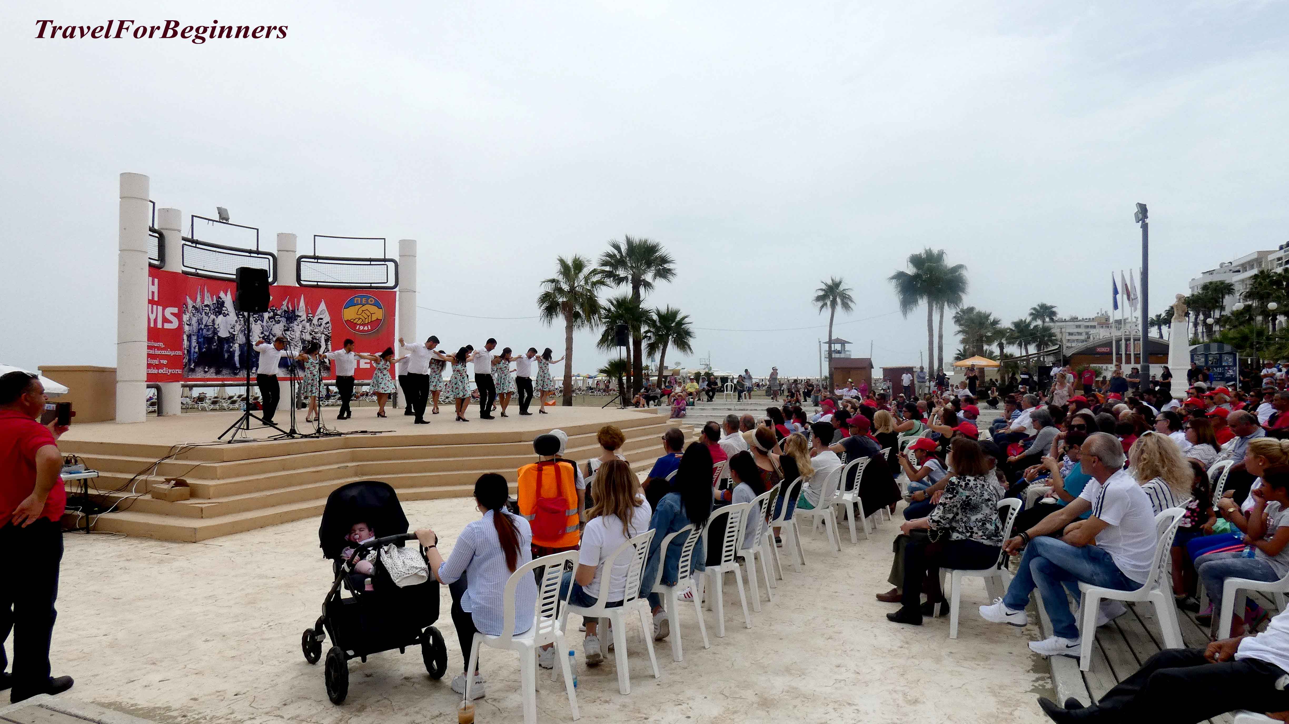 През 2019 г. Великден беше в края на април и нашето посещение съвпадна и с празника 1 май, който в Ларнака се отбелязва с шествие и концерт на сцена на плажа. А всяка къща закача венец от цветя на вратите си.