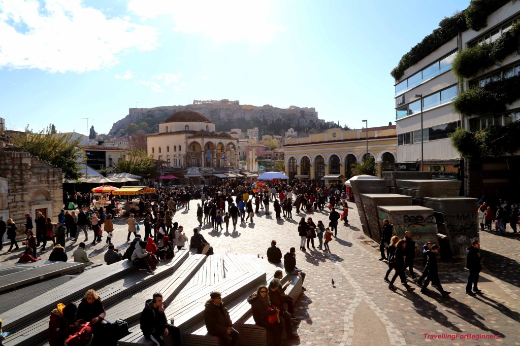 Следваща спирка – Монастираки (в превод малък манастир) . Площад “Монастираки” се намира в старата част на града, осеян с безброй таверни, кафенета, сергии, малки магазинчета, преливащи от безкрайност от сувенири … вкусно сувлаки и гирос, аромат на гръцко кафе, което се приготвя на пясък и се сервира с локум или парче домашен кекс, разкошна гледка към Акропола, хора, смесица от чуждестранна реч, балони … и очакване на Новата година с надежда. Тук се намира и пазарът Flea, рай за туристите.